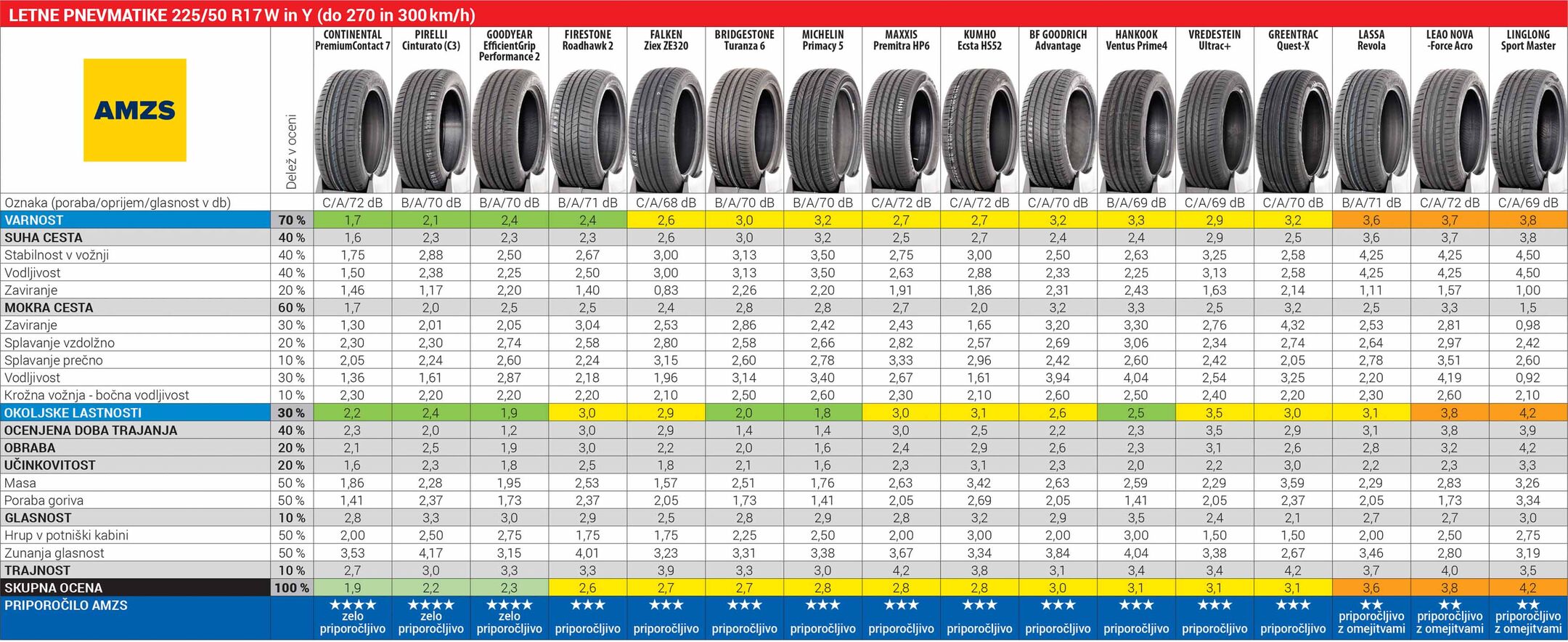 Izbira letnih pnevmatik oziroma nakupna odločitev za posamezno pnevmatiko ne vpliva le na udobje in porabo goriva, ampak predvsem na varnost v vožnji. Da bi vam omogočili čim lažjo in čim bolj objektivno odločitev, objavljamo letošnji AMZS test 16 letnih pnevmatik v dimenziji 225/50 R17. Ta dimenzija je značilna za številne avtomobile srednjega razreda; od limuzin in križancev do karavanov. Kot vselej so pnevmatike v sodelovanju s partnerskimi avtomobilskimi klubi in potrošniškimi organizacijami preskusili po strogih merilih, ki so jih združili v dva stebra ocen – varnost in okoljske lastnosti –, kot testni avto pa jim je služil audi A4 avant, značilen družinski karavan srednjega razreda.