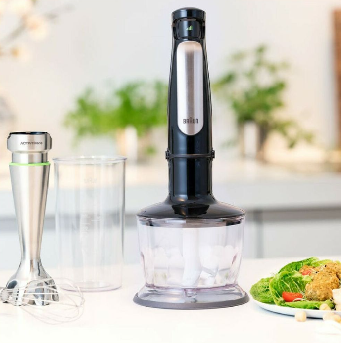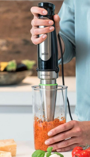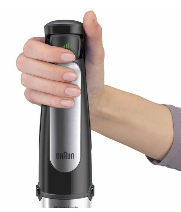Palični mešalnik Braun MultiQuick 7 je zasnovan tako, da vam pomaga pripraviti zdrave obroke za vašo družino in prijatelje – hitro in enostavno. Ima prvo tehnologijo ActiveBlade na svetu. Ta inovativna gibljiva gred vam nudi 250 % bolj aktivno rezalno površino za delo* – pameten kuhinjski pomočnik, s katerim lahko delo opravite z lahkoto. Vsebuje tudi Braunovo tehnologijo Easy SmartSpeed, ki omogoča nadzor s samo enim dotikom. Preprosto pritisnite na kontrolni gumb, da intuitivno in brez prekinitve prilagodite moč. *V primerjavi s paličnimi mešalniki Braun z gredjo brez ActiveBlade.