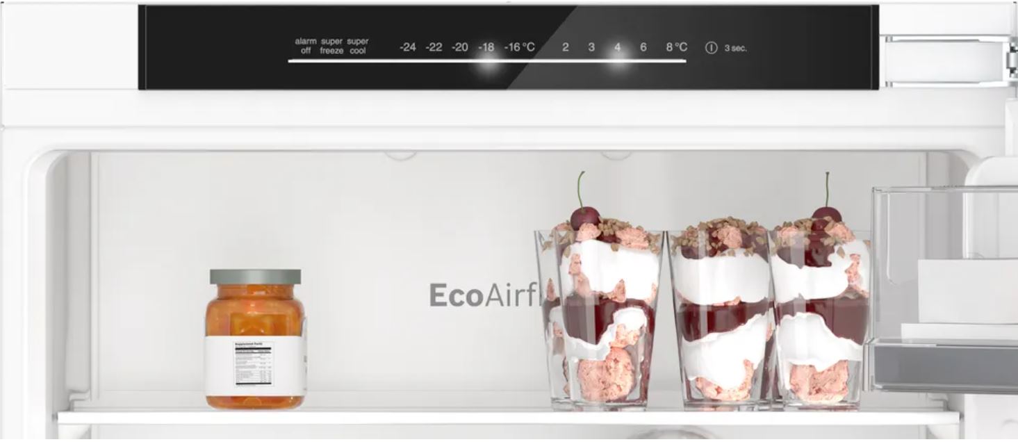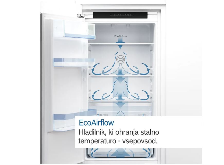 Neenakomerna temperatura v hladilniku lahko vpliva na okus in rok trajanja hrane.Eco Airflow skrbi za enakomerno razporeditev vlažnosti in temperature, tako da vaša živila ostanejo sveža dlje.