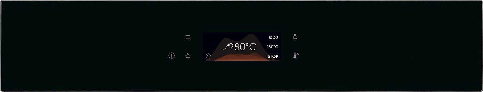Priloženo: 1x rešetka, 1x pekač za sladice iz sivega emajla, 1 x globoki pekač iz sivega emajla, 1x enonivojska izvlečna vodila, variabilna, sonda za meso Barvni zaslon, upravljanje na dotik, funkcija spomin, za shranjevanje najpogostejših uporabljenih programov, možnost slovenskega jezika, temperaturni razpon 30°C - 300°C |