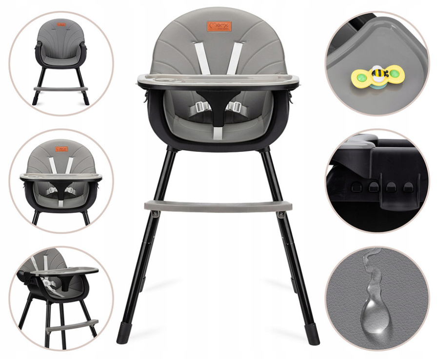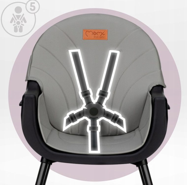 MoMi REKI skrbi za varnost vašega dojenčka zahvaljujoč ergonomskemu oblikovanju in 5-točkovnim pasom, ki poskrbijo za stabilnost vašega otroka med obroki. Udobna opora za noge in širok sedež z dobro profiliranim naslonjalom podpirata pravilno držo hrbtenice in zagotavljata udobje na vseh stopnjah razvoja.