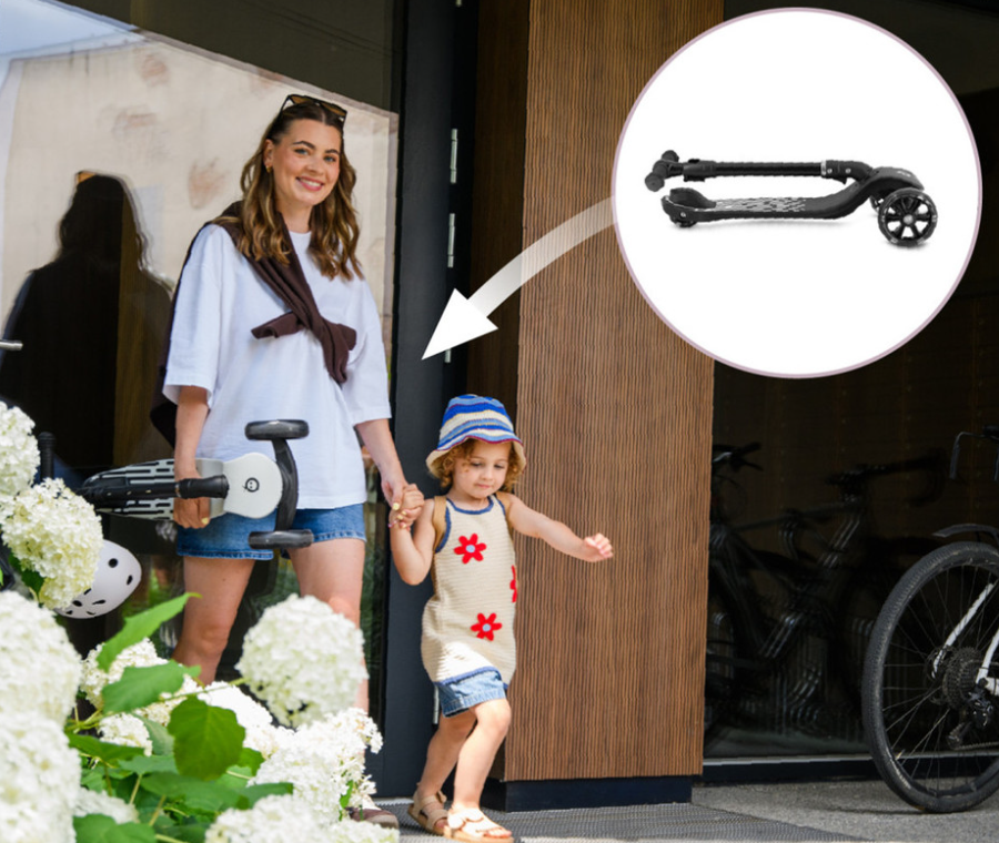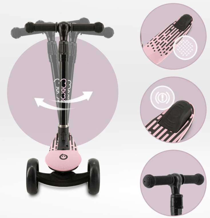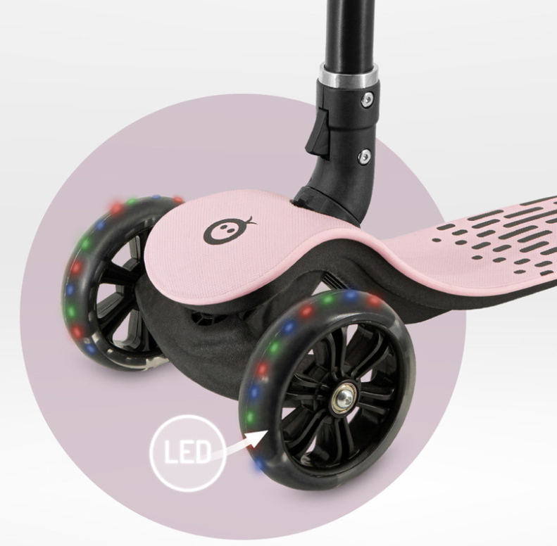 MoMi SAN je 3-kolesni skiro za ravnotežje, ki je idealen za učenje vožnje. Je stabilen in varen za otroke. Ima nedrsečo površino in ročaje . Najpomembnejša lastnost za otroke so kolesa z LED lučkami , za starše pa zložljiv ročaj olajša prevoz in shranjevanje.