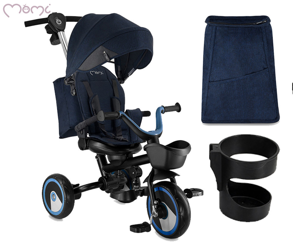 Tricikel MoMi IVI ima kar 3 funkcije. Najmlajši uporabniki lahko sedijo obrnjeni proti staršem , ki ga vozijo, starejši otroci pa lahko uživajo v vožnji s svojim triciklom s pedali. Ima nastavljiv sedež in naslonjalo, nastavljiv naslon za noge in funkcijo prostega teka. Priloženi so uporabni dodatki, kot sta torba in držalo za skodelico.
