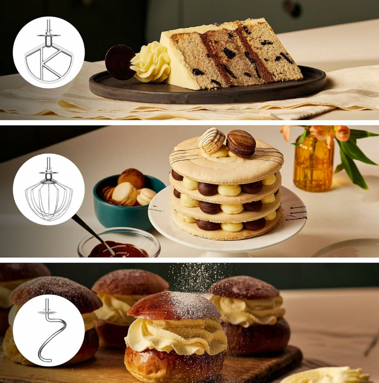 S kompletom treh robustnih orodij ste vedno pripravljeni. Vsak kMix je opremljen z metlico za stepanje, kavljem za testo in našim prepoznavnim K-Beaterjem – pravim pekovskim vsestranskim orodjem.