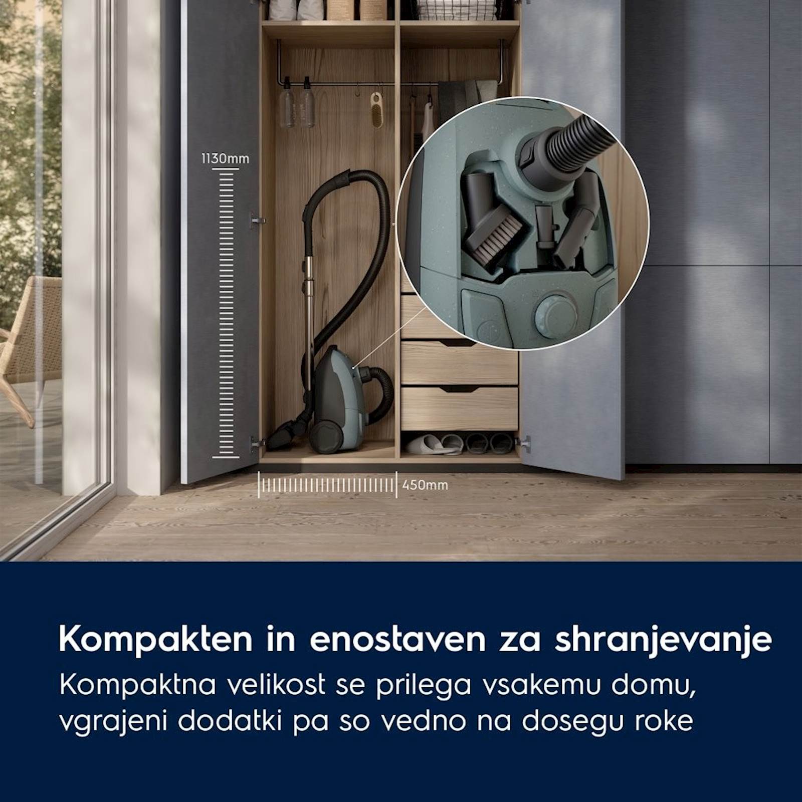 Kompaktna velikost sesalnika zagotavlja primernost za vsak dom, dodatna oprema pa je priročno shranjena, tako da imate vse, kar potrebujete, vedno pri roki.