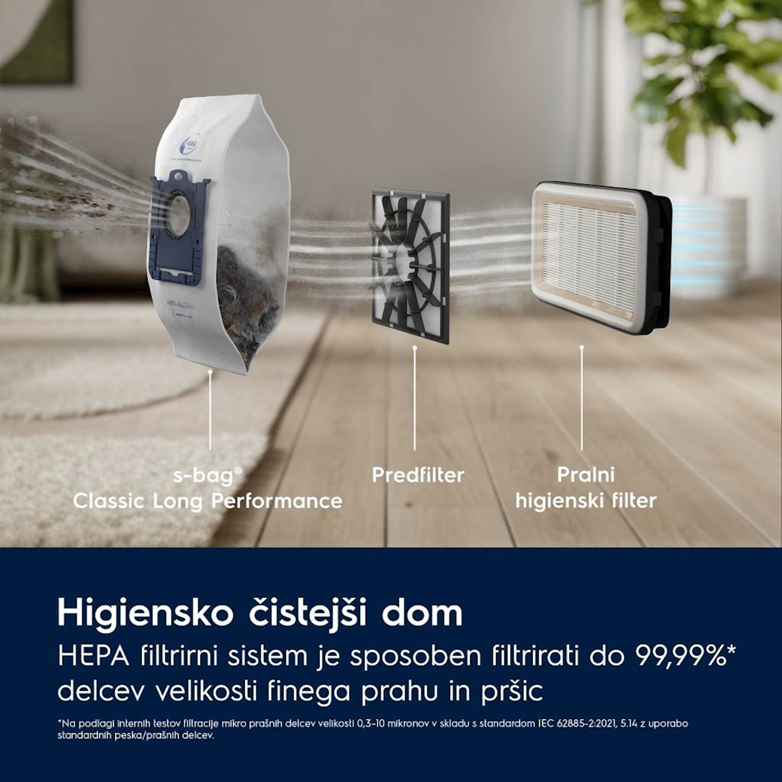 Zahvaljujoč novemu nastavku AllFloor in veliki moči sesanja brez truda pobere prah in umazanijo s trdih tal in preprog. Menjavo nastavka lahko zamenjate s pritiskom noge. Zahvaljujoč teleskopski cevi, velikim kolesom in radiju čiščenja 8,5 metra, ga je mogoče enostavno premikati in čistiti brez prekinitev. Sistem visokega filtriranja zmore filtrirati do 99,99 %* delcev in pršic velikosti 1 mikrona, za čistejši izhodni zrak. (*Na podlagi internih testov filtriranja mikro prašnih delcev velikosti 0,3 do 10 mikronov, v skladu s standardom IEC62885-2:2021, 5.14 z uporabo standardnih peščenih/prašnih delcev.)