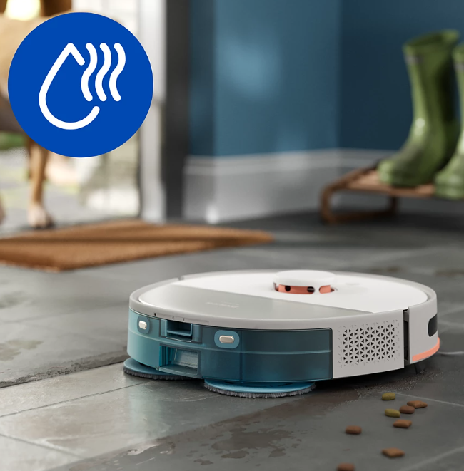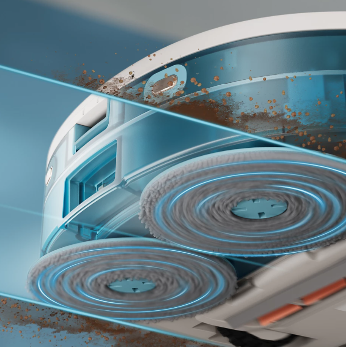 Sesalnik sesa in briše trda tla hkrati, pri čemer učinkovito odstrani fino plast prahu, ki se nabira vsak dan, ter tudi zahtevne nečistoče, kot so blatni odtisi tačk hišnih ljubljenčkov in madeži. Dvojni krpi sesalnika sta zasnovani tako, da sta nežni do površin, a učinkovito odstranita umazanijo. S prostornino posode za vodo, ki je opremljena tako, da z enim čiščenjem pobriše vse, kar je potrebno, vam prihrani čas in trud. Uživajte v brezhibno čistih tleh in samozavesti zaradi čistih nog, tudi če ste bosi.