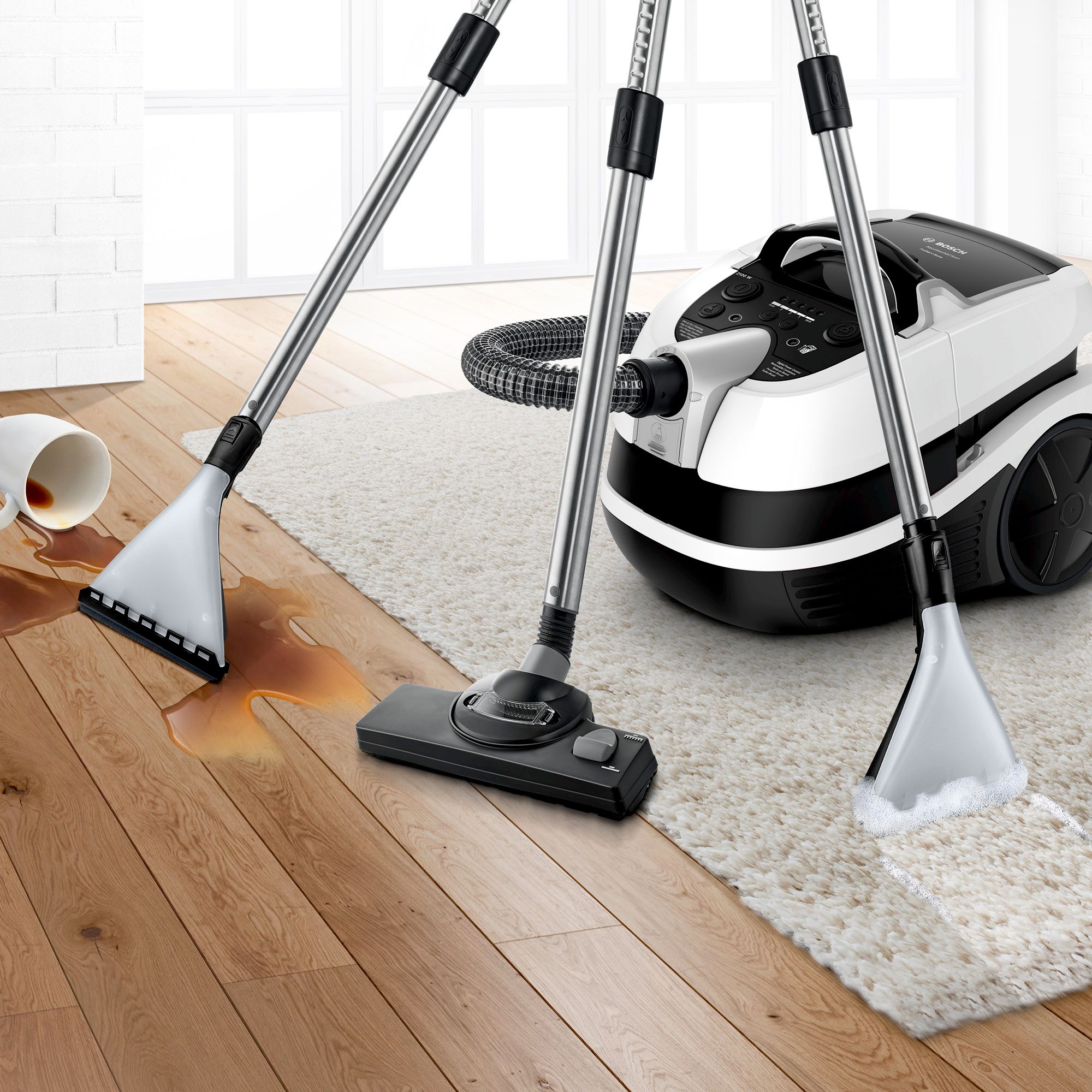Običajno potrebujete za mokro in suho čiščenje različne aparate. Sesalnik AquaWash&Clean vključuje vrsto posebej zasnovanega dodatnega pribora za mokro in suho čiščenje. Zdaj lahko operete preproge in oblazinjeno pohištvo, posesate tekočino in očistite trda tla – vse to z enim sesalnikom.