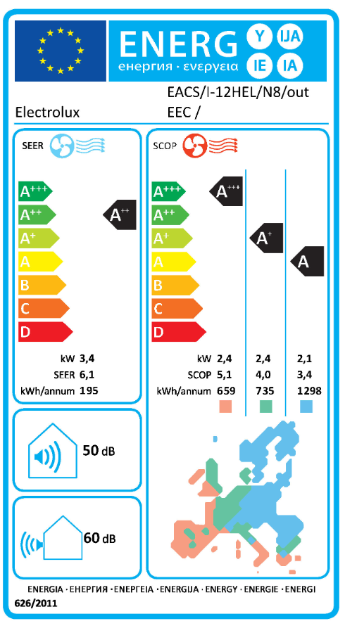 Electrolux EACS/I-12HEL/N8 EEC ponuja visoko sezonsko energetsko učinkovitost, ki dosega SEER 6,1 (hlajenje – razred A++) in SCOP 4,0 (ogrevanje – razred A+), kar pomeni manjšo porabo električne energije in nižje stroške skozi vse leto. Naprava je opremljena z inteligentnim DC inverter kompresorjem RECHI, ki samodejno prilagaja moč delovanja glede na potrebe, kar podaljšuje življenjsko dobo in zmanjšuje porabo.