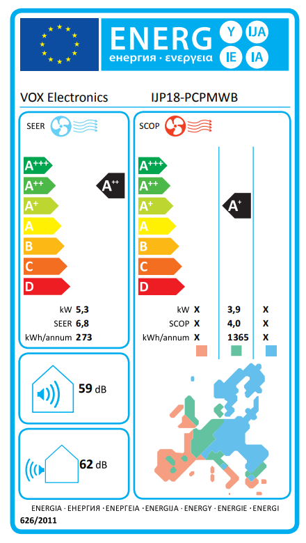 Nazivna moč: 5,3 kW SEER: 6,8 Razred energetske učinkovitosti: A++ |