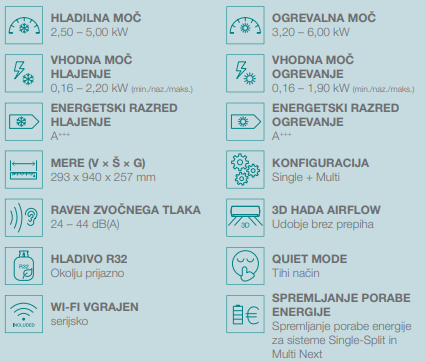 | Notranja enota | Raven zvočnega tlaka (nizko/srednje/visoko): 24/-/40 (hlajenje), 25/-/41 (gretje) 293 x 940 x 257 mm 16 kg |