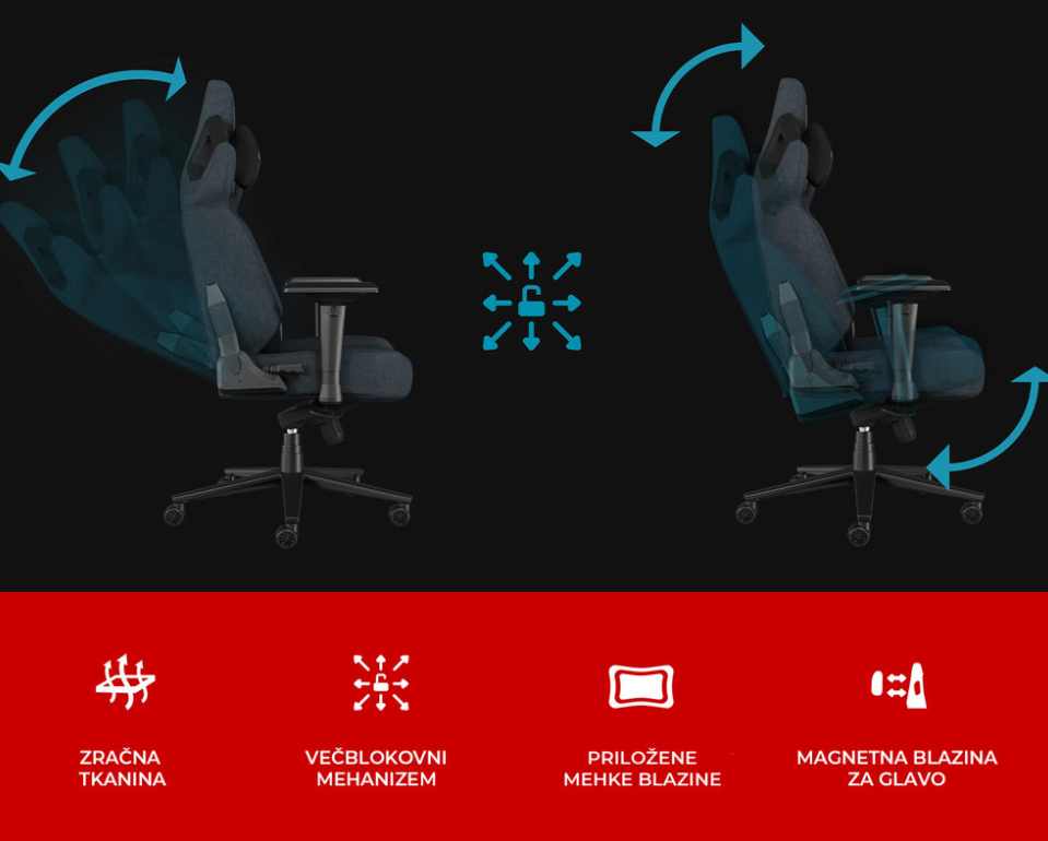 - 4D nastavljivi nasloni za roke - enostavno prilagajanje po višini in usmerjenosti in velikosti.