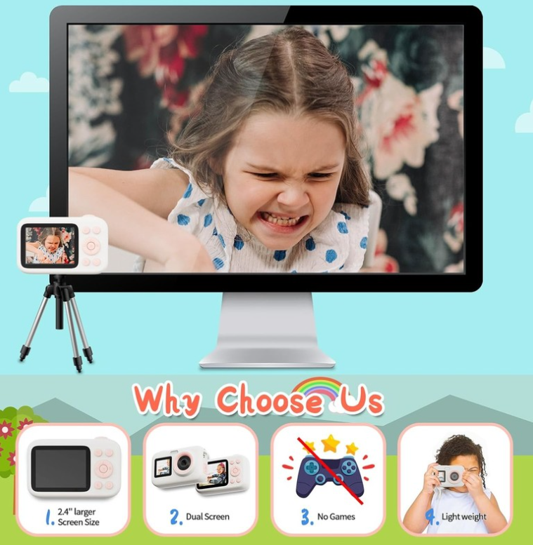 Za razliko od drugih otroških kamer je ta otroška kamera posebej zasnovana brez iger, da vaši otroci ne bodo več zasvojeni z igrami, temveč jih spodbujamo, da gredo ven in raziskujejo naravo s fotografiranjem in snemanjem svojega srečnega otroštva. Ta otroška kamera je zasnovana tako, da z enim gumbom preklaplja med načini, brez potrebe po izbiri načina na strani z menijem, kar je za otroke zelo enostavno, da se naučijo uporabljati in postanejo mali fotografi.