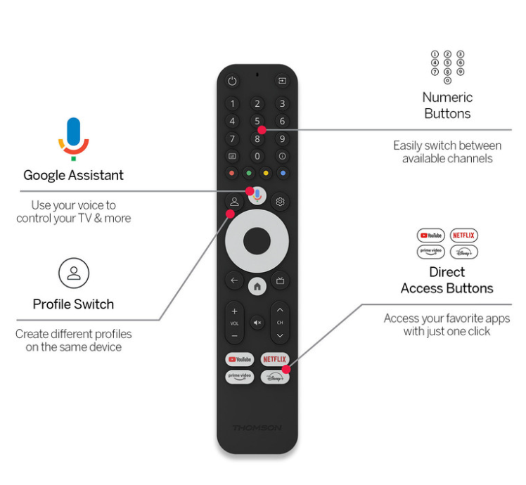 - Pametni daljinski upravljalnik je zasnovan za udobje in hitrost, ter ima glasovno podporo Google Assistant in gumbe za hiter dostop do aplikacij.