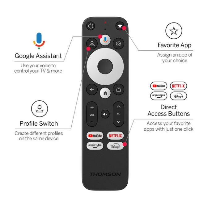 Priloženi daljinski upravljalnik je zasnovan za udobje in hitrost ter ima glasovno podporo Google Assistant.