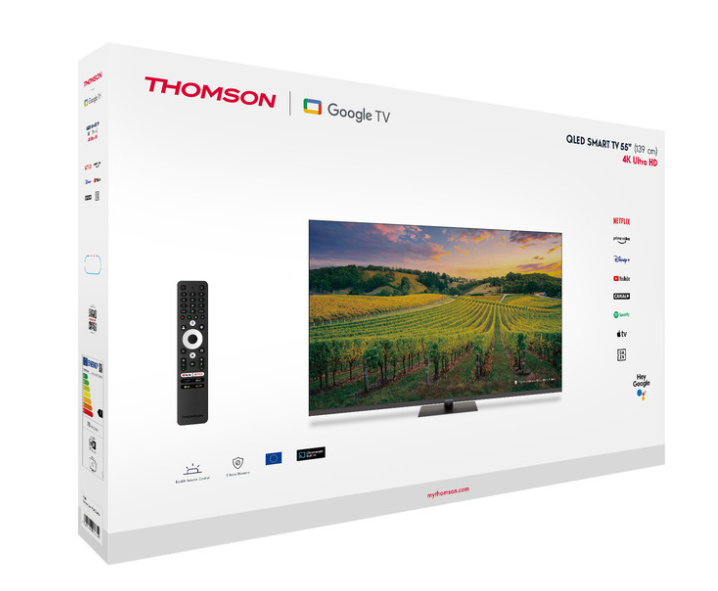 Doživite tekoče slike in visoko odzivnost v bogati kakovosti 4K UHD s Thomson Google TV 55" QLED.