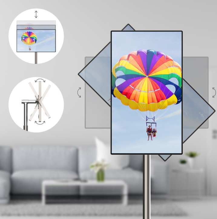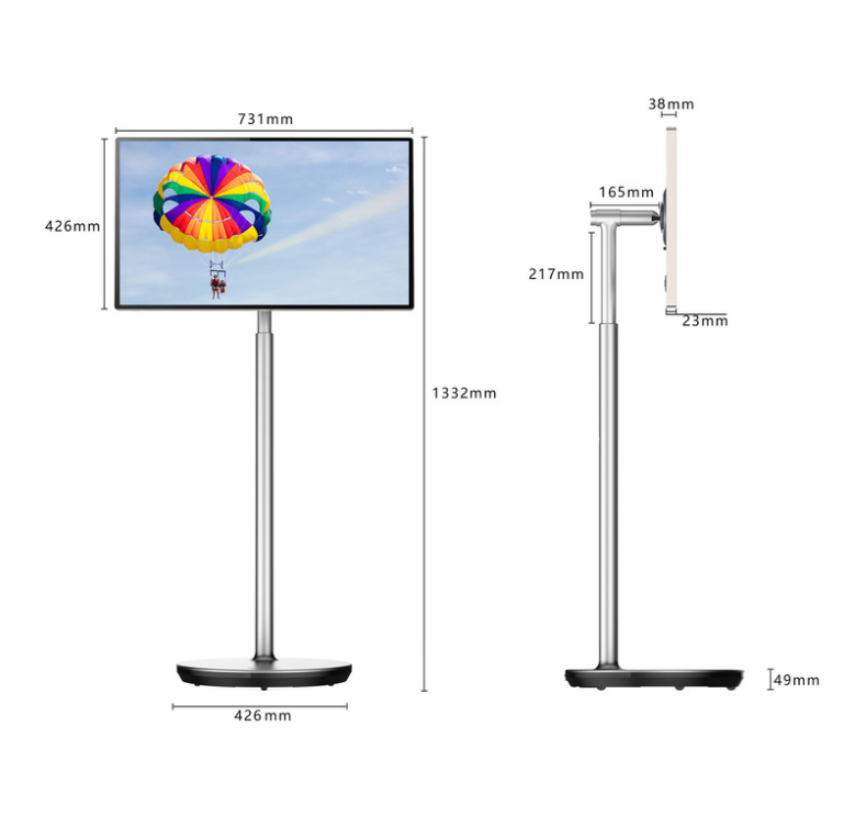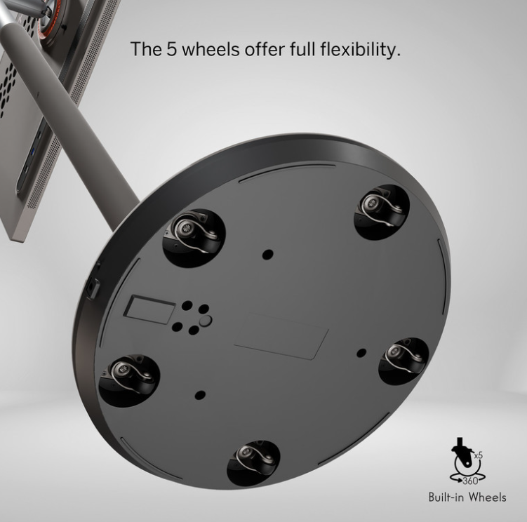 Kolesca na dnu omogočajo enostavno premikanje, nastavljivi nagib, višina in vrtenje pa zagotavljajo popoln kot gledanja. Zaradi tega je mobilni pametni televizor idealen za vsestransko gledanje.